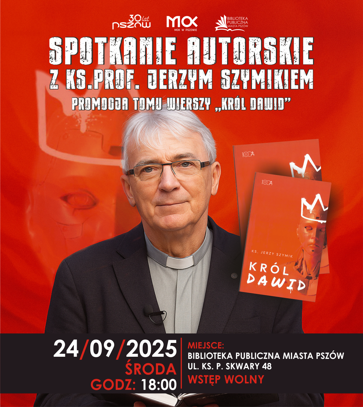 Biblioteka w Pszowie przy ul. ks. Pawła Skwary 48 zaprasza na wyjątkowe spotkanie autorskie, promujące nowy tom poezji ks. prof. Jerzego Szymika. „Król Dawid” to trzynasty autorski zbiór wierszy znanego teologa i poety, który tym razem sięga po biblijną opowieść o królu Dawidzie – od jego powołania po kres życia. Zbiór wierszy ukazuje drogę człowieka uwikłanego w grzech i miłosierdzie, nieustannie zmagającego się z wyborem miedzy tym, co ludzkie i tym, co Boże. Autor oddaje głos postaci sprzed wieków, czyniąc jej historię zaskakująco współczesną, pełną napięć i duchowych zmagań.