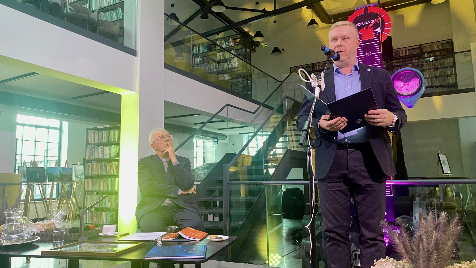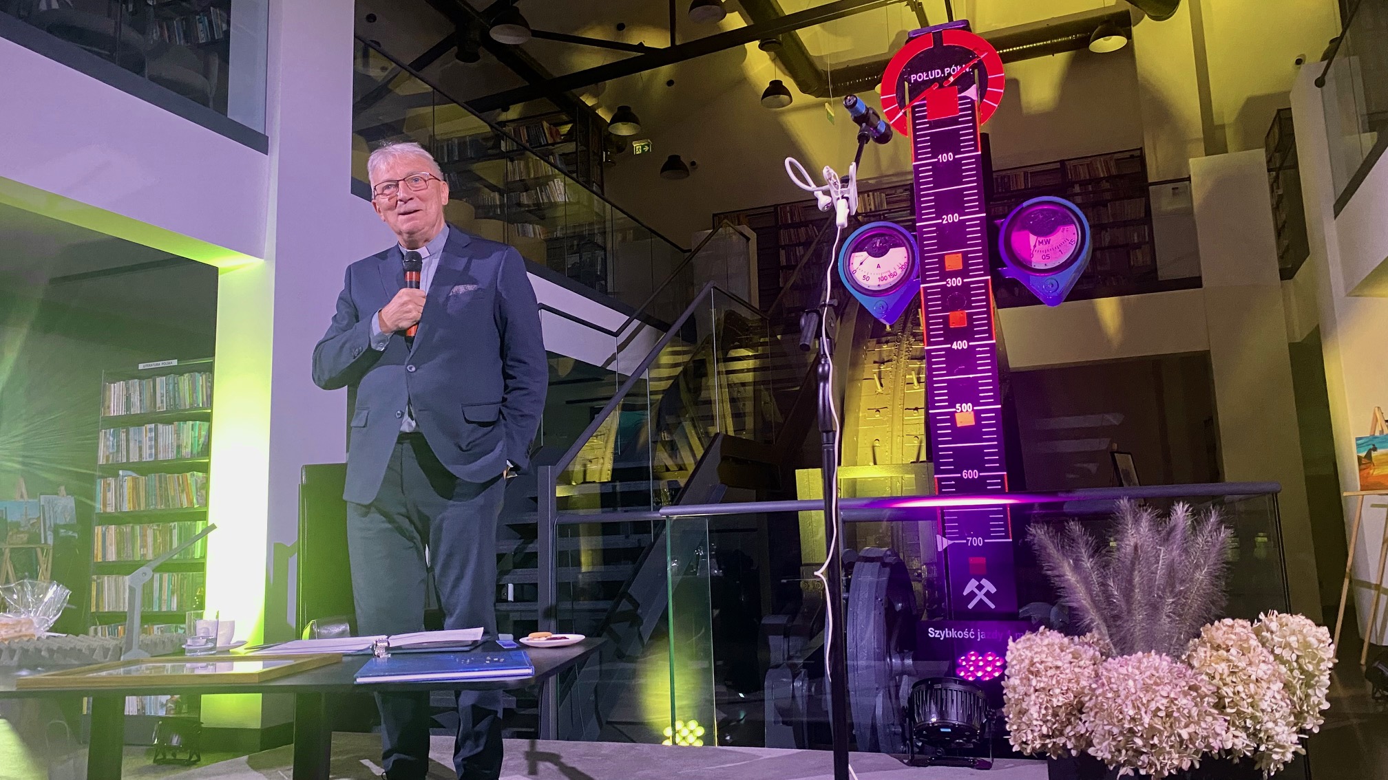Wieczór rozpoczął się od wręczenia księdzu Jerzemu Szymikowi przez burmistrza Pszowa, Piotra Kowola, pamiątkowej grafiki z mapą miasta, wydanej z okazji 30-lecia odzyskania przez Pszów praw miejskich. - Nasze spotkania z twórczością księdza profesora Jerzego Szymika pokazują, że Pszów jest zawsze w jego sercu, słowie i umyśle. Jesteśmy z tego dumni – mówił. - To ważne, zwłaszcza w tym miejscu, które jeszcze nie tak dawno było przemysłowym sercem miasta - dodał burmistrz, wskazując na zrewitalizowany pokopalniany budynek, w którym dzisiaj działa nowoczesna biblioteka.