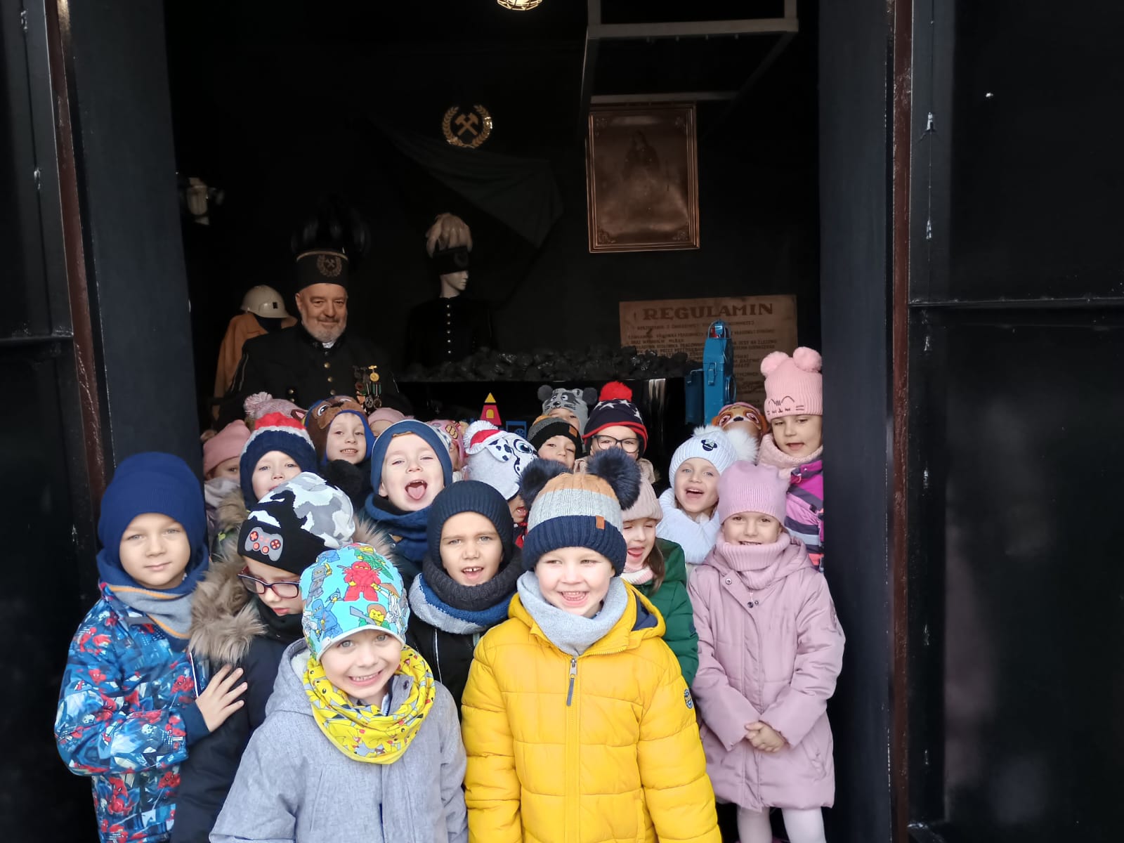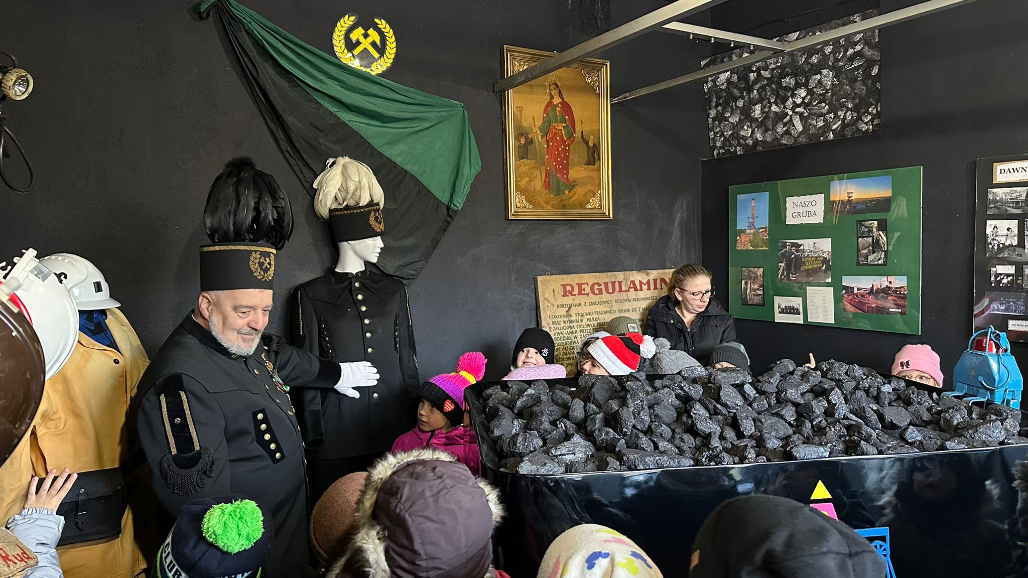 Nie zabrakło również spotkania z panem konserwatorem, panem Mirkiem, który przez lata pracował na kopalni. W Izbie Pamięci, działającej od 2022 roku, przeprowadził wyjątkową lekcję, prezentując narzędzia i pamiątki górnicze – lampy, kaski, odzież roboczą oraz strój galowy. Duże wrażenie wywarł na dzieciach górniczy wagonik wypełniony węglem, który zachwycił zarówno najmłodszych, jak i dorosłych gości.